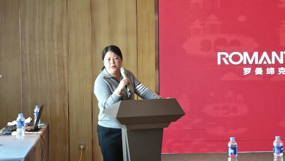 產品,是品牌最好的代言,自然也成為本次研學之旅的重要環節。羅曼締克品牌銷區經理-郭彩宏就2024主推工藝及產品矩陣等內容,從美學巖板、大理石、白韻石到素色質感磚等,羅曼締克不僅在產品設計上追求突破,更在工藝技術、材料應用等方面進行持續創新,率先打造以全品類、全規格的產品銷售鏈路,形成獨一的品牌核心競爭力,明確品牌2024年產品打法思路。