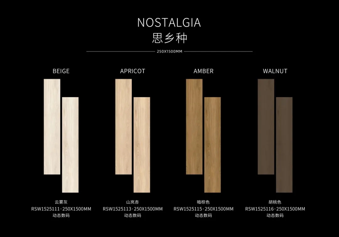 羅曼締克【思鄉(xiāng)種】木紋磚分別有云霧灰、山嵐杏、暗棕色及胡桃色四種色調(diào),淡雅和諧的中性色調(diào)營造出高雅素凈的氣韻,無論身處哪一個角落,都讓人感到輕松愜意。